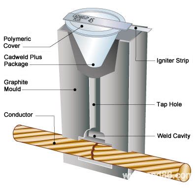 The CADWELD exothermic system makes it possible to produce copper / copper, copper / aluminium, copper / steel, and aluminium / aluminium electrical molecular bonds with no external energy or heat source. The principle consists of bridging together a welding filler material and ignition agent in a suitable graphite mould. The "weld metal" composition depends upon the metal to be welded (copper oxide and aluminium for a copper / copper weld). The reduction of copper oxide by aluminium produces molten copper and aluminium oxide slag at temperatures exceeding 2000ºC.