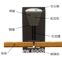 放熱焊接接是一種簡單、高效率、高質(zhì)量的金屬連接方法。它通過鋁與氧化銅等的化學(放熱)反應,產(chǎn)生高溫銅液,適用于紫銅、黃銅、青銅、鋼、不銹鋼、熟鐵等金屬材料的熔接。 放熱焊接模具左右開口式兩片模 |